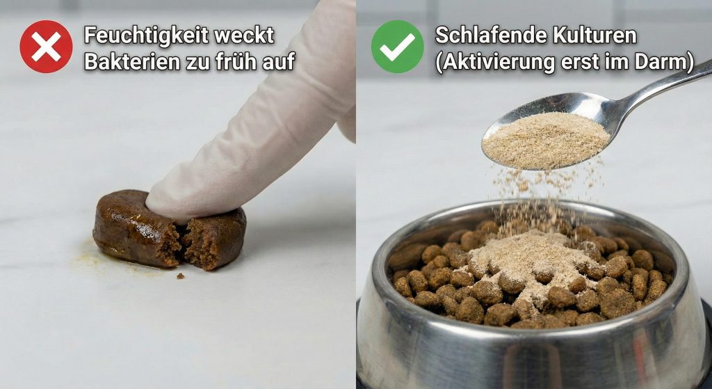 Sie deckt sich mit dem physikalischen Grundprinzip der Wasseraktivität (aw-Wert), das in der Lebensmitteltechnologie seit Jahrzehnten etabliert ist: Damit ein Probiotikum als weiches Leckerli verkauft werden kann, muss es Feuchtigkeit enthalten (oft gebunden durch Glycerin), sonst wäre es hart wie ein Stein.