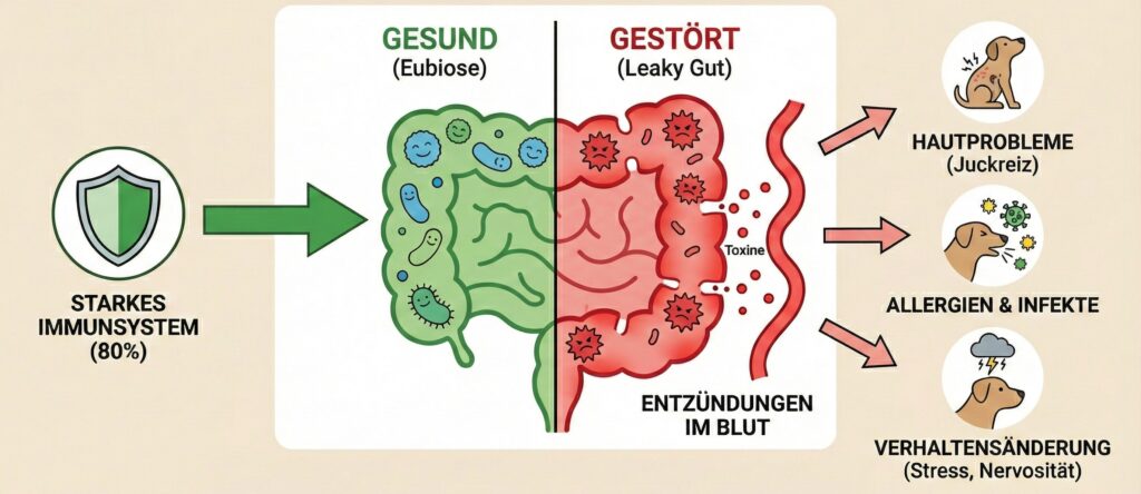 Was viele nicht wissen: Schätzungsweise 70 % aller Immunzellen sitzen im Darm.1 Der Darm ist nicht nur für die Verdauung zuständig – er ist die Schaltzentrale für fast alles. Ist die Darmflora gestört (Dysbiose), wird die Darmwand durchlässig. Man spricht vom „Leaky Gut Syndrom“. Toxine und unverdaute Partikel können in den Blutkreislauf übertreten und systemische Entzündungsreaktionen auslösen – ein Mechanismus, der in der veterinärmedizinischen Forschung zunehmend mit Hauterkrankungen und Allergien bei Hunden in Verbindung gebracht wird 2.